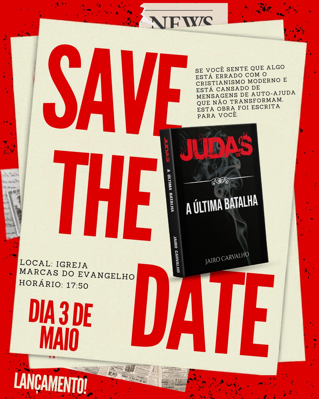 A carta de Judas é o tema do primeiro livro do pastor Jairo Carvalho, pastor presidente da Marcas do Evangelho. O lançamento será no dia 03 de maio, às 17h50, na sede da igreja em Campo Grande, Cariacica/ES. O livro também poderá ser adquirido pelo site da Marcas Editora.